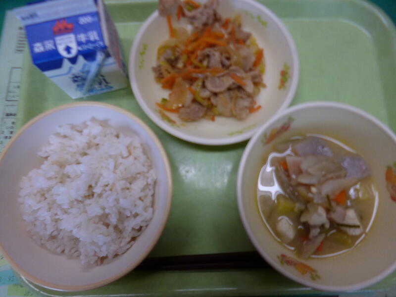 麦ごはん、牛乳、さつま汁、豚肉の生姜焼き