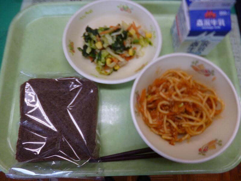 ココアパン、牛乳、スパゲティミートソース、ほうれんそうサラダ