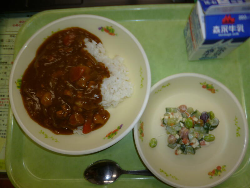 チキンカレー、ご飯、牛乳、コロコロビーンズサラダ