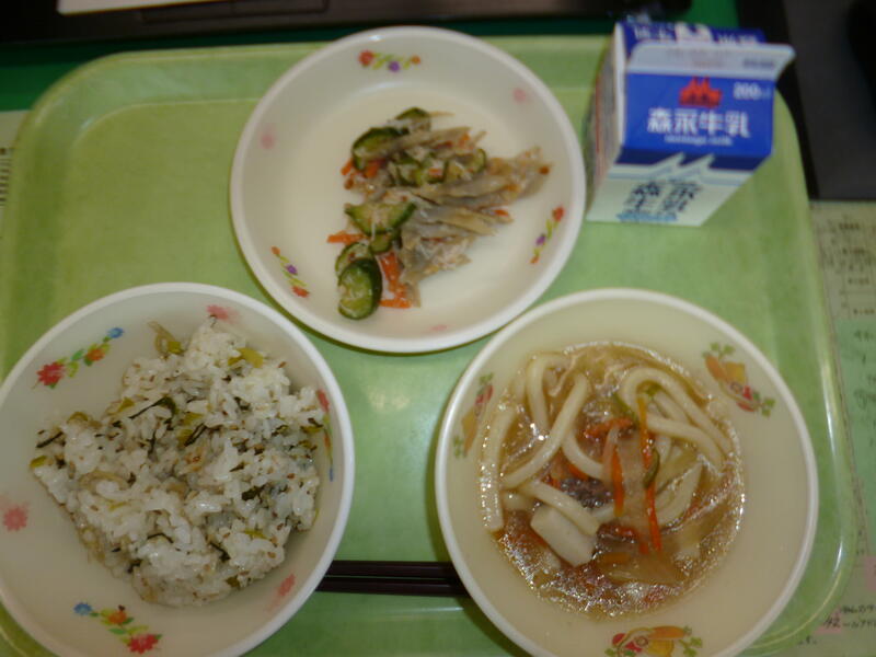 じゃこ菜めし、牛乳、肉うどん、ごぼうサラダ