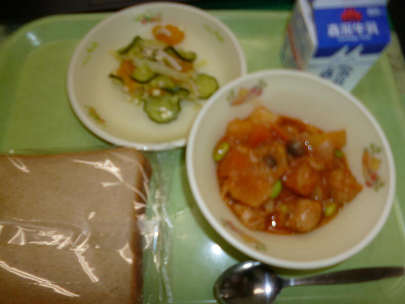黒糖パン、牛乳、ミートボールのトマト煮、ミックスサラダ