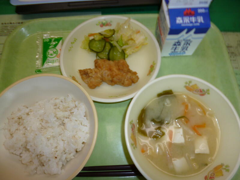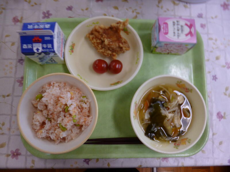 ~卒業・進級お祝い¥給食~ 牛乳、三色ご飯、鶏のから揚げ、ミニトマト、お祝いケーキ