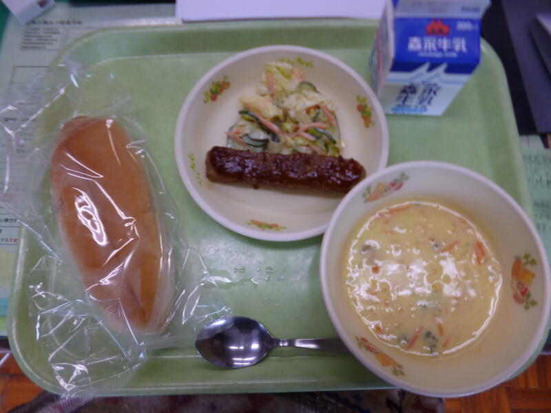 セルフドッグ(野菜サラダ、スティックハンバーグ)、牛乳、コーンスープ