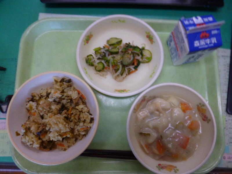 ~ふるさとくまさんデー~ 肉高菜ごはん、だご汁(阿蘇地域)、ごまじゃこ和え、牛乳