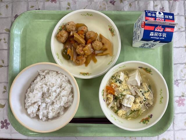 麦ごはん、きのこと卵のスープ、肉団子の甘酢あん