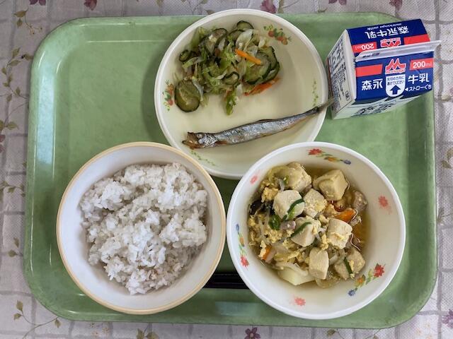 麦ごはん、高野豆腐の卵とじ、焼きししゃも、梅あえ