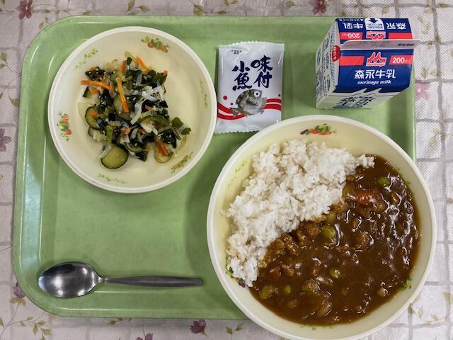 麦ごはん、チキンカレーのルウ、海草サラダ、一食いりこ