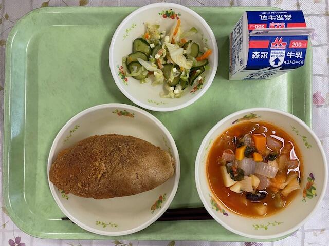 揚げパン、豆のミネストローネ、じゃことナッツのサラダ