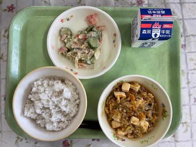 麦ごはん、ダブルマーボー、バンバンジーサラダ