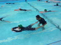 次に、歩きながら手のかきの練習をした後、いよいよコンビネーションの練習です。今日が4時間目くらいですが、みんなずいぶん上手になりました。け伸びの姿勢で進む感覚が分かった子や、手をコンパクトにかく感覚がつかめてきた子など、確実に上達できている5・6年生です。
