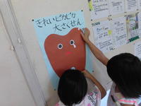 その学習を受けて、2年生は昨日(7月21日)から「きれいピカピカ大さくせん」に取り組み始めました。汚れて泣いている茶色の歯に、歯磨きがしっかりできた子供達が、白色のシールを貼っていき、みんなで泣いている歯を真っ白にしよう、という作戦です。