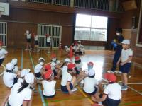 体育館なので全力では走れませんが、ついつい力が入ってしまします。走った後は、着順に整列します。走る人を拍手で応援することも大切です。