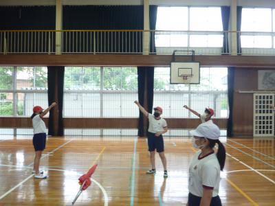 今日(5月21日)、雨は降っていないものの、昨日の大雨で運動場が使えません。そこで、4年生は体育館でできる練習として、徒走の流れを確認していました。