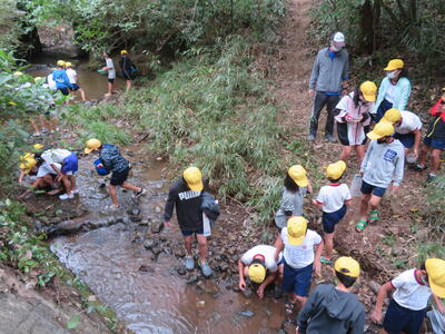 今週から少し肌寒くなってきたこともあり、はじめは「冷たい!」と言っていた子供たちですが、あちこちから「カニ見つけた!」「魚おった!」と声が上がり始めると、みんな夢中で生き物探しに取り組んでいました。