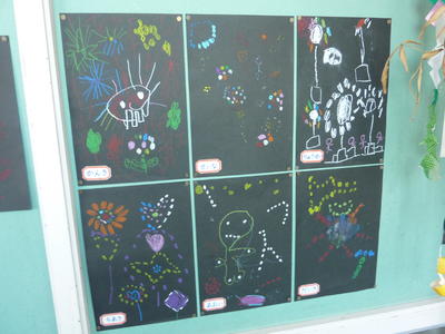 1年生が図工の時間に描いた作品です。この夏は、打上げ花火を見ることはできないかもしれません。子供たちは、「花火を見たいな」という願いを込めて描いたことでしょう。