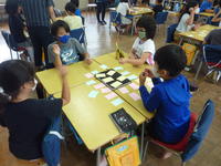 まずは、英語の歌を歌って楽しい雰囲気で授業がスタートしました。次に、今日の学習につながるカードゲームを班で楽しみました。