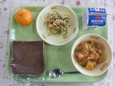 ココアパン、ミートボールのトマト煮、ごぼうとナッツのカミカミサラダ、みかん、牛乳