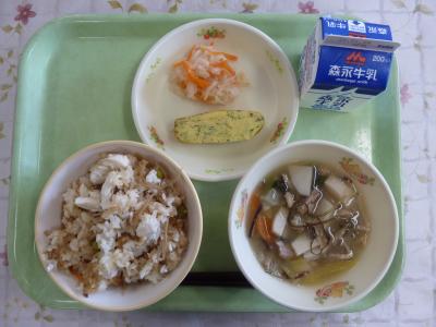 鯛飯、具雑煮、ほうれん草のだし巻き卵、紅白なます、牛乳