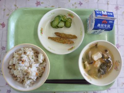 切り干し大根の混ぜご飯、チゲ風スープ、きびなごカレーフライ、カリカリきゅうり、牛乳