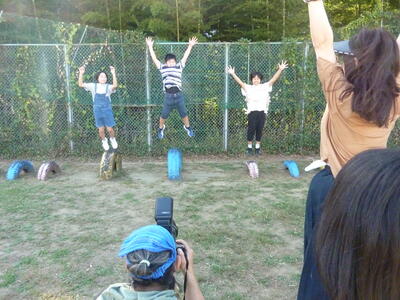 こちらはグループ写真の撮影です。思い思いの場所で、動きのある写真が撮れたようです。担任もいい動きを引き出そうと一生懸命です。