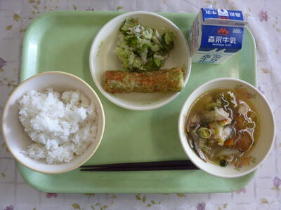 麦ごはん、ちゃんこ風スープ、ちくわの磯辺揚げ、キャベツのゆかり和え、牛乳