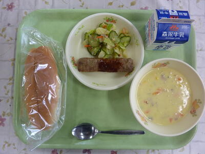 セルフドッグ(コッペパン、スティックハンバーグ、ナッツサラダ)、コーンスープ、牛乳