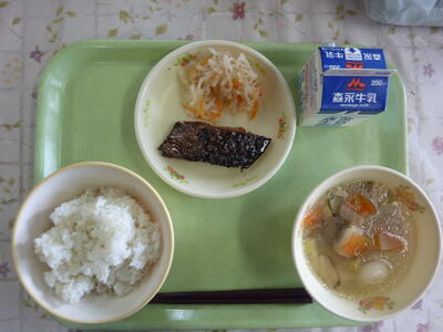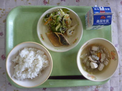 麦ごはん、鶏ごぼうスープ、鯖のゆず味噌煮、ひじき和え、牛乳