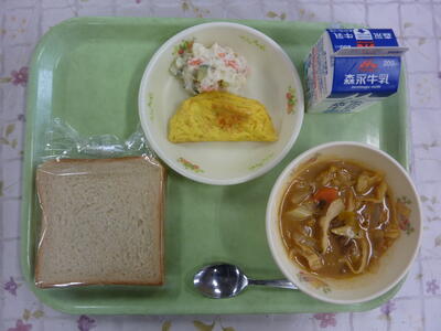 黒糖パン、ボルシチ風スープ、トマトオムレツ、サラート・オリヴィエサラダ、牛乳