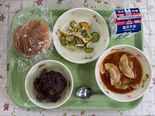 いきなりあんぱん(丸パン)、ラビオリスープ、ミックスサラダ、いも入りあんこ