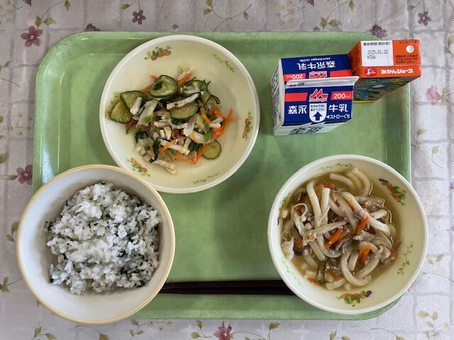 わかめごはん、豚肉となすのうどん、ほうれん草サラダ、みかん果汁