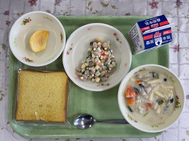 米粉入り人参パン、チンゲン菜のクリーム煮、大豆のサラダ、柿