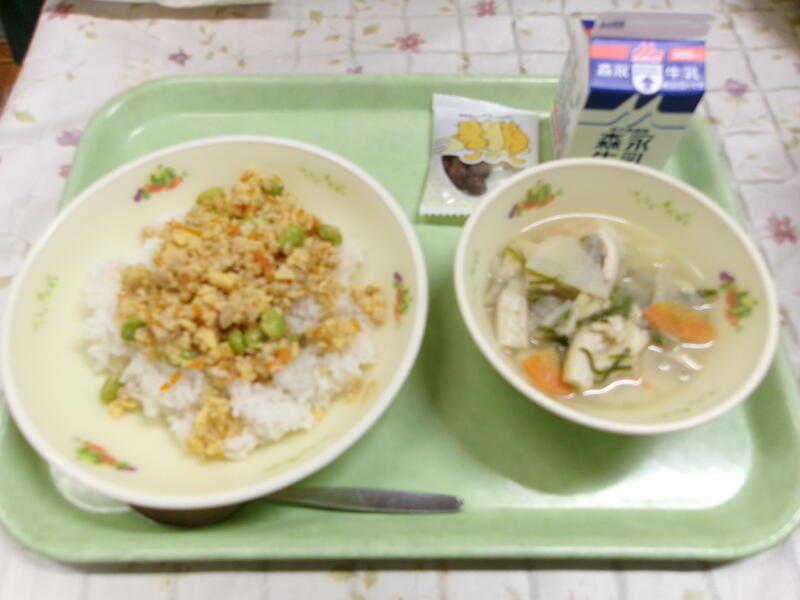 鶏そぼろ丼(麦ごはん)、根菜のごま汁、鶏そぼろ丼の具、黒糖ビーンズ