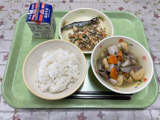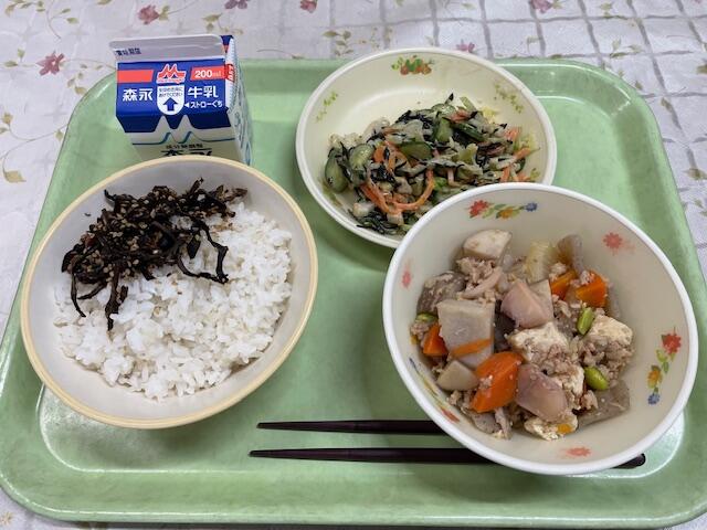 麦ごはん、芋煮、青のりししゃも、こんにゃくの白和え