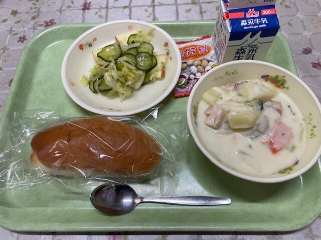 ミルクパン、鮭のクリーム煮、キャベツとりんごのサラダ、節分豆
