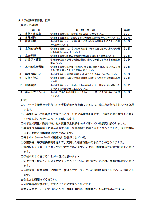 また、行っていただいた「学校関係者評価」の結果も下に掲載しますのでご覧ください。(ポイントは4が満点です)