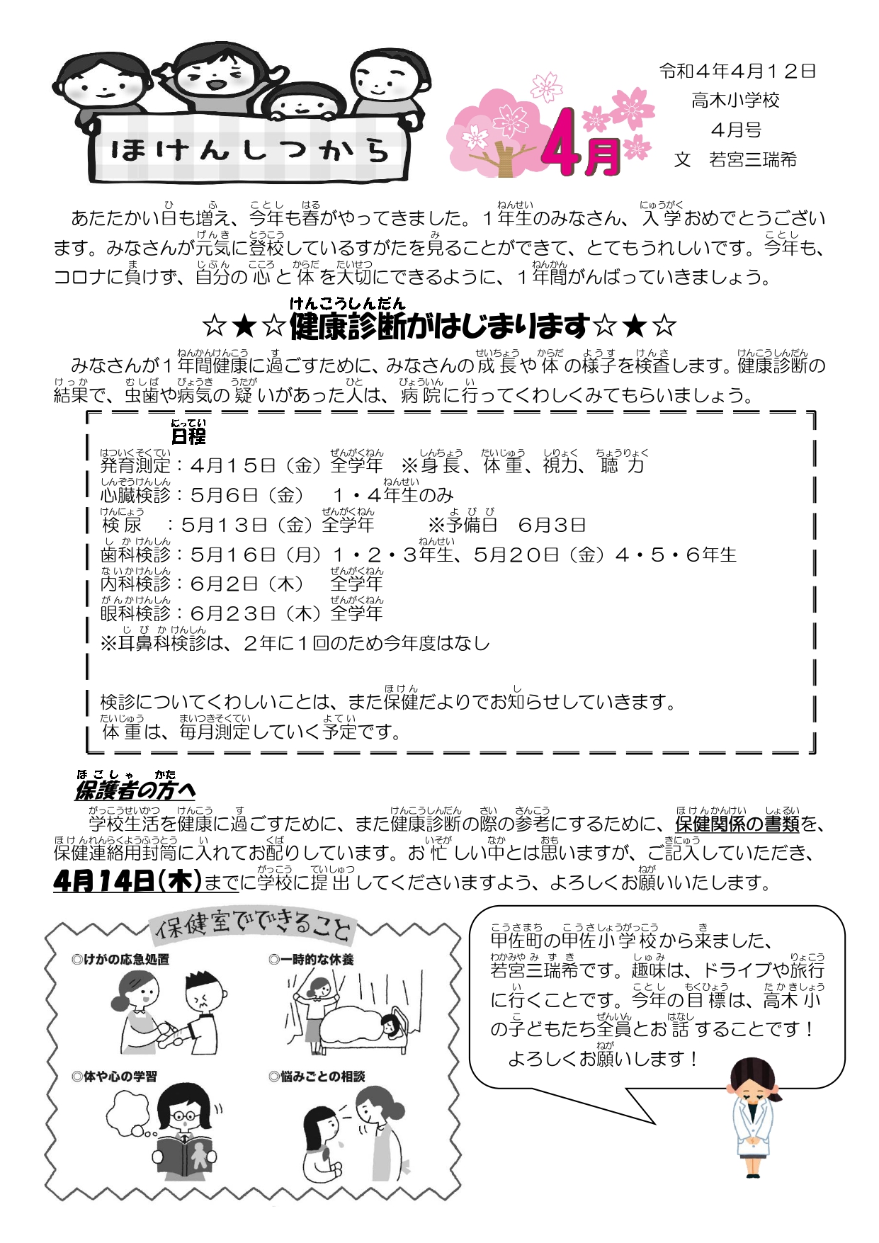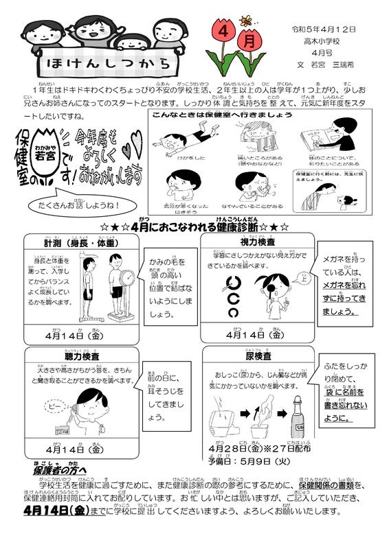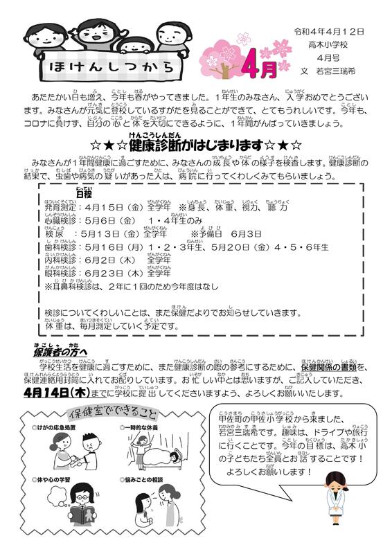 新年度が始まりました。保健コーナーでは、各月の保健だよりや保健に関するお知らせ等を発信していきます。