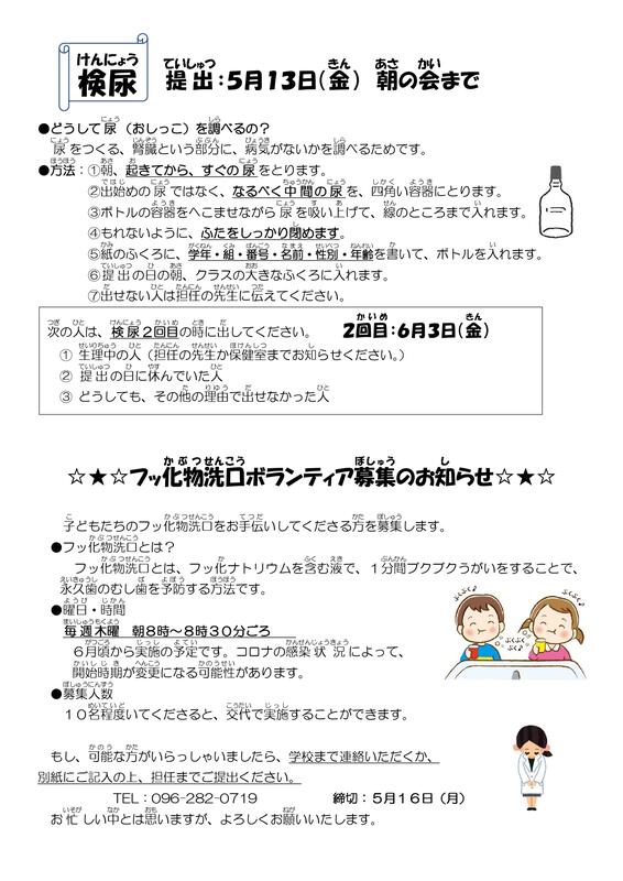 いよいよ6月1日から学校教育活動が再開されます。しかし、全国的にはまだまだ感染が収束してはいない状況です。今後も、万全な感染防止対策が必要です。
