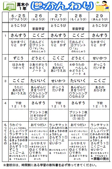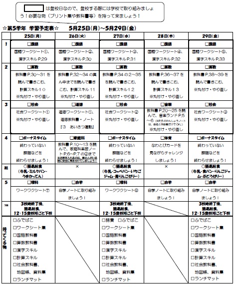 5月25日(月)・27日(水)・29日(金) 3時間授業 簡易給食あり(パンと牛乳) 12:15下校予定
