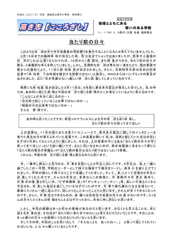 保護者の方々へは、本日配布いたしますが、地域の方々へはプリント物での配布が難しい状況ですので、本ホームページに掲載いたします。