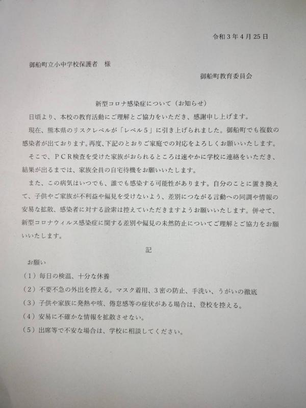 下に御船町教育委員会からのお願いの文書を掲載しますので、ご確認ください。