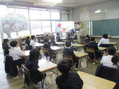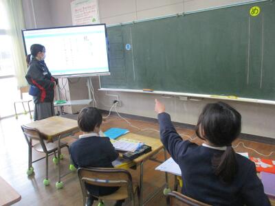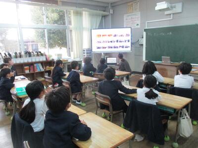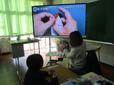 1年生教室では、新1年生の体験入学に向けた準備をはじめるために、去年の1年生たちがどんなことをしてくれたか写真を見ながら話し合っていました。あおぞら4組さんでは、折り紙で今年の干支「午」づくりに挑戦中。大画面に手順を映して確かめながら折り進めました。あおぞら3組さんでは、新出漢字の練習が始まっていました。電子黒板に大きく映し出され書き順もわかりやすく示されてとても便利です。どの教室でも、電子黒板が大活躍していました。