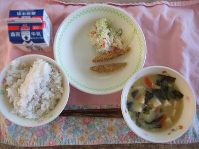 今日の給食のおかずは「大根と南関あげの味噌汁、きびなごカリカリフライ、おからサラダ」でした。アツアツで届く味噌汁は、体を芯からあたためてくれます。おからサラダは、ポテトサラダに似た食感に仕上げてありました。