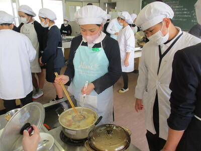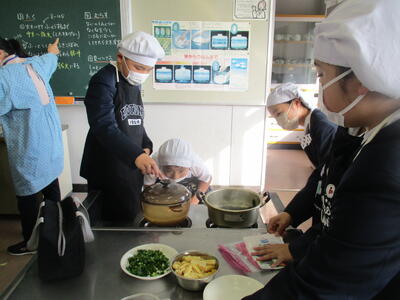 ご飯と味噌汁の調理の仕方を学習した5年生たち。今日は、自分たちで実際につくる調理実習でした。お米と味噌汁に入れたい具材を持参し、班ごとに調理をすすめます。ご飯は、半透明の鍋を使って炊ける様子を観察しました。西村先生の説明を聴きながら、フツフツと煮えるお米を食い入るように見つめていました。味噌汁は、イリコで出汁をとり、火の通りにくいものから先に入れて、最後に味噌をといで出来上がりです。どの班も具だくさんで美味しく仕上がりました。みんなで協力して、よくがんばりました。