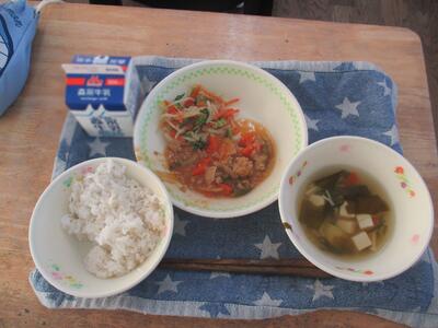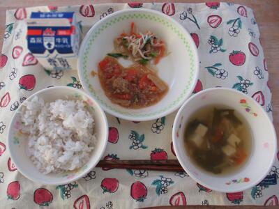 今日の給食のおかずは「たぬき汁、豆腐のハンバーグのチーズ焼き、もやしとチンゲン菜のごまあえ」でした。豆腐ハンバーグは、ふんわりとした食感でとても美味しかったです。