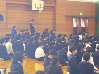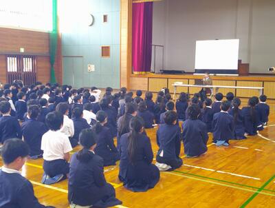 1月24日から30日までを全国学校給食週間と定められていることから、毎年1月に給食集会を行っています。給食の意義や役割について、子どもたちの理解を深め、関心を高めるための集会です。今日は、給食センターから緒方先生を招いて全校生で給食集会を行いました。