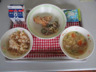 今日の給食は「キムタクご飯、たまごスープ、鶏のから揚げ、スタミナサラダ、もちクリームアイス」でした。高道小6年生のリクエスト給食。パワーの出るメニューで、みんな大喜びでした。ごちそうさまでした。