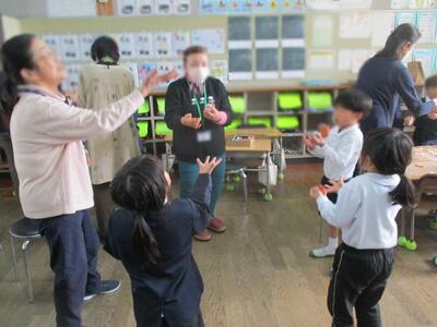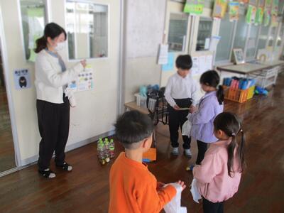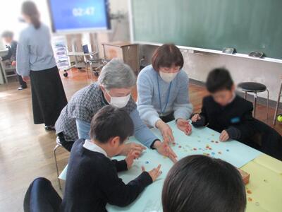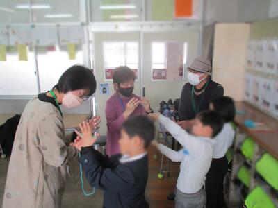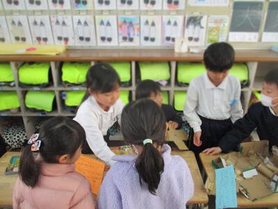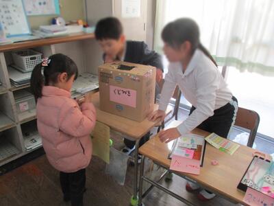 秋のおもちゃランドに高道保育園の年長さんをお招きしようと準備を進めてきましたが、他の行事やインフルエンザの流行等で延期になっていた交流会を、ようやく実施できました。手作りのおもちゃを並べ、年長さんに楽しんでもらいます。やさしく教えたり、心配そうに見つめたり。たくさんの遊びコーナーを作り、おみやげを作り、がんばった1年生たち。年長さんに喜んでもらってとても嬉しい1時間でした。4月から一緒にたくさん遊ぼうね。