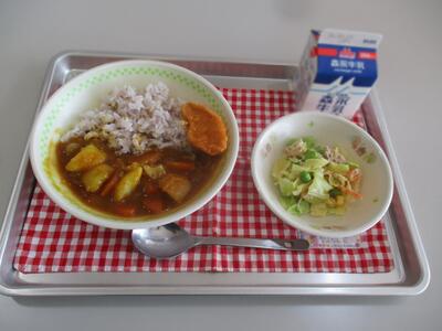 今日の給食は「根菜カレー、雑穀ごはん、チキンナゲット、コーンと枝豆のサラダ」でした。歯応えのあるレンコンやゴボウの入ったカレー。食のカレーは、どうしてこんなに美味しいのでしょう!ごちそうさまでした
