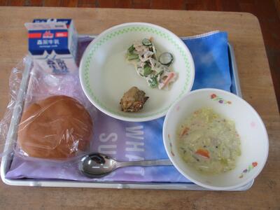 今日の給食は「丸パン、春のシチュー、鶏肉のレモン焼き、レンコンサラダ」でした。シチューには、春キャベツがたっぷり入っていました。甘い甘いシチューでした。