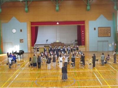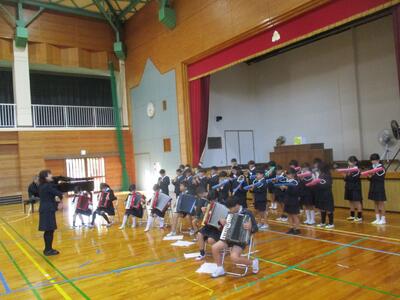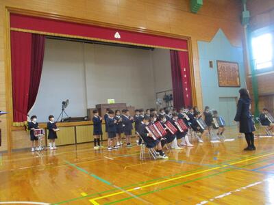 あさって19日(水)に控える音楽会を前に、4年生たちが合奏を披露してくれました。曲名は、「アイネクライネナハトムジーク第一楽章」鍵盤ハーモニカとリコーダー、アコーディオンで奏でられるメロディーラインを、タンバリンと小太鼓が支えます。絶妙な音の重なり合いから生まれる美しい旋律に、聴いているみんなも釘付けです。みんなで呼吸を合わせ、見事に仕上がってきました。毎日毎日、朝も昼も音楽の時間も、こつこつと練習を続けた「やりぬく力」を発揮した4年生たち。たくさんの応援をいただきましたので、きっと本番もすてきな演奏を聴かせてくれると思います。応援ありがとうございました。